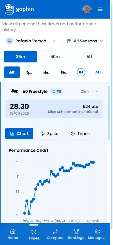 Gophin shows your progress across every event with clear evolution charts. Spot trends. See which strokes are dropping. Know what's working in training—backed by real data, not guesses.